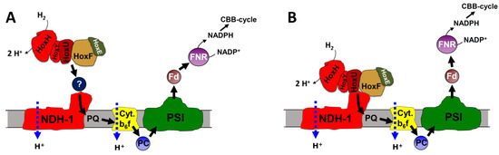 The second issue concerns the oxidation of hydrogen (also known as hydrogen uptake) that is catalyzed by the bidirectional hydrogenase after a short phase of photohydrogen evolution or when hydrogen is provided under anaerobic conditions in the light and photosystem II is blocked. Under these conditions, H2 serves as a reductant for CO2-fixation [11,12]. It still remains to be solved if the electrons that are delivered to the Calvin–Benson–Bassham (CBB) cycle are mediated either via ferredoxin (Fd) or NAD(P)H (H2- > Fd- > PQ- > PSI- > CBB (Figure 1C) or H2- > NAD(P)H- > CBB (Figure 1B)), or if they are fed into the PQ pool by a hydrogenase bound to the NDH-1 complex (H2- > PQ- > PSI- > CBB, Figure 1D).