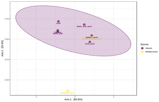 - Sebastián, M.; Ortega-Retuerta, E.; Gómez-Consarnau, L.; Zamanillo, M.; Álvarez, M.; Arístegui, J.; Gasol, J.M. Environmental gradients and physical barriers drive the basin-wide spatial structuring of Mediterranean Sea and adjacent eastern Atlantic Ocean prokaryotic communities. Limnol. Oceanogr. 2021, 66, 4077–4095. [Google Scholar] [CrossRef]