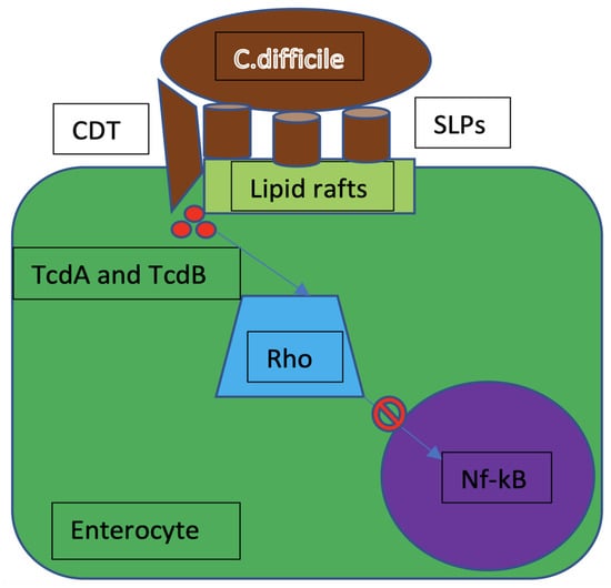 Clostridium difficile (C. difficile) is a Gram-positive, spore-forming, anaerobic bacillus, which is widely distributed in the intestinal tract of humans and animals but also in the external environment. Transmission of this pathogen occurs by the fecal–oral route []. C. difficile produces two types of toxins, A and B (TcdA and TcdB), which are both enterotoxic and cytotoxic; some C. difficile strains are able to produce a third toxin, called C. difficile transferase (CDT). Toxins are transported to the cell cytoplasm, where they inactivate the Res-homologous (Rho) family of GTPases. The Rho protein takes part in actin polymerization, and therefore stabilizes the cell cytoskeleton []. TcdA and TcdB induce glycosylation of the Rho GTPases. In this form, Rho is inactive and the NFkB pathway is inhibited. This is a mechanism of immune escape. Rho inactivation is also associated with lower secretion of Toll-like receptor (TLR)-induced inflammatory cytokines and chemoattractants (Figure 1) []. The pathophysiological mechanisms by which C. difficile toxins are able to induce necrosis of the intestinal epithelium is not entirely understood. Given the excellent results, however, secured by treatment against C. difficile with fecal transplantation, it can be inferred that the intestinal microbiota has a crucial role in the cytotoxic effect of C. difficile [].