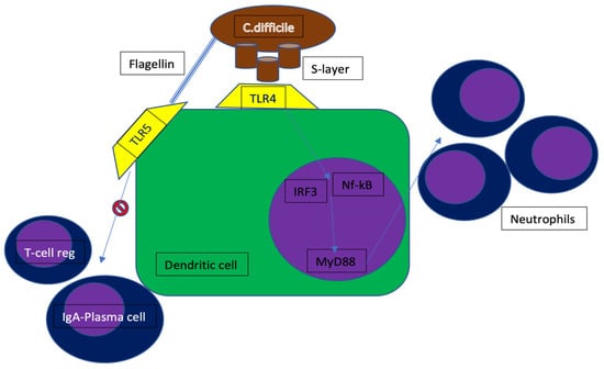 CDAC is the most common nosocomial infection mainly due to the administration of several antibiotic agents leading to a dysregulation of the colon microflora. This risk of CDAC is particularly increased by the exposure to broad spectrum antibiotics like penicillins and cephalosporins []. Other risk factors are older age and prolonged hospitalization []. The unbalance in gut microflora favors the maturation of C. difficile’s spores that are physiologically present in the colon lumen. The main symptom of CDAC is severe diarrhea (colitis) that causes electrolytic, plasma proteins (i.e., albumin), and fluid losses leading to hypovolemic shock. In particularly frail patients, the disruption of colon mucosa may allow the passage of bacteria from the intestinal lumen to blood vessels, thus causing sepsis and septic shock []. Other severe complications of CDAC include toxic megacolon, perforation, intestinal paralysis, kidney failure, and systemic inflammatory response syndrome (SIRS) []. CDAC should be ruled out in any case of diarrhea onset in a patient treated with antibiotics. This finding should prompt a test with enzyme immunoassay (EIA) of a stool sample to detect C. difficile toxins. It is also possible to detect C. difficile by testing its antigens with high sensibility and specificity, but this test does not detect toxins. Amplification of toxin genes by PCR is a highly sensitive and specific technique; however, it cannot tell whether the C. difficile strain is producing toxins or not []. C. difficile expresses surface layer proteins (SLPs or S-layer), composing a reticulum that contacts toll-like receptor 4 (TLR4), expressed on the host cell surface. S-layer binding to dendritic cells initiates downstream signaling of the nuclear transcription factor kappa β (NF-kB) and interferon regulatory factor 3, resulting in the production of inflammatory cytokines and the activation of immune cells. In vitro studies have also shown that signaling depends on the myeloid differentiation regulator gene 88 (MyD88), which is involved in neutrophil recruitment. In fact, TLR4-deficient and MyD88-deficient mice were more susceptible to infection and showed a worse clinic profile than controls. This displays that neutrophils are crucial in preventing bacterial dissemination through the damaged mucosa. In addition to the superficial proteins, the flagellum protein of C. difficile is also an activator of the immune response. The flagellins of b-proteobacteria and g-proteobacteria are in fact recognized by TLR5, which is expressed by enterocytes and resident dendritic cells. Activation of TLR5 decreases the secretion of immunoglobulin A and inhibits the generation of regulatory T-cells (Figure 2). Besides TLRs, sensors of intracellular innate immunity, including the nucleotide-containing intracellular domain 1 (NOD1) and the IL-1β/inflammasome domain, are also activated during CDI. In response to CDI, Nod1-deficient mice showed a decreased chemokine production, lower neutrophil recruitment, a higher bacterial translocation, and higher mortality than controls [].