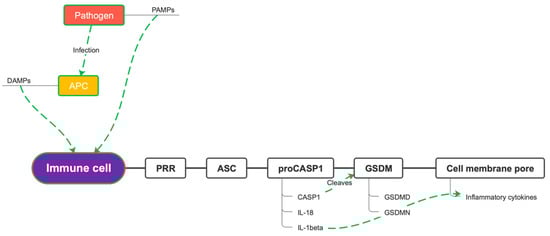 Inflammasomes are multiprotein cytosolic oligomers of the innate immune system mainly involved in the activation of inflammatory responses, against pathogens and other damage-associated signals []. Inflammasome requires a structural modification of the cytoskeleton, involving microtubules, of the neutrophils and macrophages in which the complex is formed []. The inflammasome typically consists of the following components: pattern recognition receptors (PRRs), the apoptosis-associated adaptor speck-like protein containing a caspase recruitment domain (ASC), and a zymogen that activates pro-inflammatory caspases (pro-CASP1). Inflammasome formation begins when the cytosolic sensor senses pathogen-associated molecular patterns (PAMPs), expressed by pathogenic microbes, damage-associated molecular patterns (DAMPs), expressed by host cells during cellular damage, stress signals, or cell death []. PRRs recruit ASC, which links the sensors to the effector pro-CASP1, this last cleaves into active caspases leading to the activation and assembly of the inflammasome, thus promoting proteolytic cleavage, maturation, and secretion of the pro-inflammatory cytokines interleukin 1β (IL-1β) and interleukin 18 (IL-18), as well as Gasdermin-D cleavage []. Gasdermin-D (GSDMD) is the substrate of pro-inflammatory caspases involved in inflammasome formation. Under resting conditions, GSDMD consists of an N-terminal subunit linked to a C-terminal subunit that acts as an autoinhibitor. The pro-inflammatory caspases cleave the bond between the two subunits, thus leaving the GSDMD-N free to bind to the plasma membrane and form a pore. Pore formation on the cell membranes causes osmotic swelling of the cell and eventually pyroptosis []. Pyroptosis and IL-1β secretion itself are mediated by Gasdermin D (GSDMD). This is shown by the fact that deletion of GSDMD in the mouse model of familial Mediterranean fever (FMF) results in the extinction of the inflammatory response and in the complete prevention of systemic complications and tissue damage effects mediated by IL-1β attraction of neutrophils and macrophages. GSDMD is crucial for the downstream production of IL-1β-dependent inflammatory chemokines such as IL-6, TNF, IL-18, IL-17A, RANTES, MCP-1, IFN-γ, IP-10, and G-CSF (Figure 3) []. Recently, a study conducted on irradiated mouse models of pulmonary infestation by Aspergillus fumigatus demonstrated that levels of GSDMD higher than normal were maintained even after the clinical remission of the aspergillosis []. There are several types of inflammasomes. The canonical inflammasome can be nucleated by the NLR (nucleotide-binding oligomerization domain and leucine-rich repeat-containing receptors) members NLRP1, NLRP3, and NLRC4 or by the ALR member AIM2. Additional NLR family members (e.g., NLRP2, NLRP6, NLRP7, and NLRP12) and the ALR family (e.g., NLRP1, NLRP3, and NLRC4, IFI16) have been demonstrated to have the ability to assemble the inflammasome, but the biological functions of these inflammasomes are not well-established and further studies are necessary to validate their real impact in the setting of the inflammatory response and disease [].