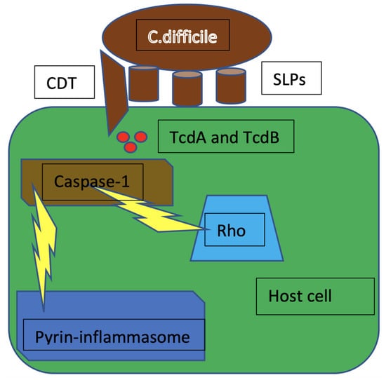 C. difficile mechanisms of infection involve the binding of SLPs with cholesterol-rich microdomains, known as lipid rafts, in the host’s cell membrane. SLPs are divided into a stable high molecular weight protein and a variable low molecular weight protein, resulting from the cleavage of the product of the gene slpA. Following adhesion, TcdA and TcdB enter the host through protrusion induced by CDT. C. difficile adhesion to infected cells triggers the release of inflammatory cytokines like IL-1β and IL-23. Chen et al. demonstrated that SLPs induce the release of IL-1β and the maturation of caspase-1, thus activating the inflammasome []. C. difficile SLPs activate the inflammatory response through binding to the toll-like receptor 4 (TLR4) of enterocytes. This causes the activation of the transcription factor nuclear factor kB (NF-kB), which induces the transcription and translation of genes coding for inflammatory cytokines whose task is to recruit leukocytes to the site of infection. Prominent among these cytokines are IL-1β and IL-18, the production of which occurs through the formation of the pyrin inflammasome by the binding of pyrin to the adaptor ASC []. Inflammasome activation is an important mediator of the innate immune response that requires a priming and an activation phase following which a cleavage occurs, thus leading to a particular type of cell apoptosis, called pyroptosis, with release of inflammatory cytokines by dead cells. In general, the main factors that trigger inflammasome activation are the recognition of PAMPs and DAMPs or the action of bacterial toxins. In the context of CDI, the pyrin inflammasome can be activated by sensing the inactive state of Rho GTPases, which are in turn inactivated by toxins A and B. The action of the inflammasome results in the release of pro-IL-1β and IL-8 from the pores of the cytoplasmic membrane [].