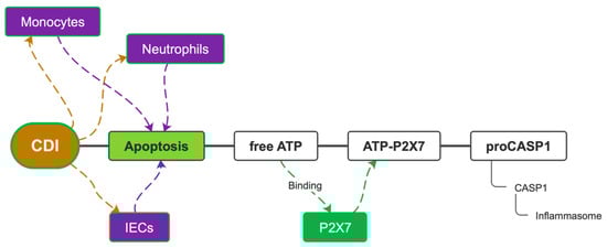 Pyroptosis of enterocytes is the primary mechanism of defense against CDI, but it also causes diarrhea and loss of integrity of tissues, thus, allowing other bacteria penetration into blood flow and sepsis. This excessive inflammatory response is largely sustained by the constant production of IL-1β. Pharmacological inactivation of IL-1β by Anakinra has been shown to reduce mucosal damage ex vivo []. Although the role of the pyrin inflammasome in the genesis of the inflammatory response to CDI seems predominant, it has been shown that the pathway of the ATP-P2X7 (adenosine triphosphate—purinergic receptor 2X7) complex, known as an activator of NLRP3, is essential for the inflammatory response itself. Inhibition of P2X7, in fact, completely turns off inflammation. The ATP-P2X7 complex is formed when intracellular ATP is released from enterocytes, neutrophils, and monocytes that have undergone various types of apoptosis. This substrate binds P2X7, forming a complex capable of immediately activating caspase-1 and inducing pyroptosis (Figure 5). P2X7 is also involved in cellular antibacterial defense mechanisms such as the formation of phagolysosomes in monocytes and the release of oxygen free radicals (ROS) []. CDI is the leading cause of antibiotic-associated diarrhea, currently representing a significant health burden. Although the role and contribution of C. difficile toxins to the pathogenesis of the disease is increasingly understood, other aspects of C. difficile–host interactions, particularly the effects of the bacterium on host immunity, are currently less well studied. Using an ex vivo infection model, it has been reported that the human gastrointestinal mucosa elicits a rapid and significant cytokine response to C. difficile: a marked increase in IFN-c with a modest increase in IL-22 and IL-17A. The significant increase in IL-8 suggested a potential influx of neutrophils, while the presence of IL-12, IL-23, IL-1β, and IL-6 suggested a cytokine environment able to modulate subsequent T-cell immunity []. C. difficile toxins A and B are certainly the major causes of pyrin inflammasome activation in neutrophils and monocytes; however, intestinal epithelial cells (IECs) are the primary target cells of C. difficile exotoxins. It is not yet known whether in vivo inflammasome signaling by pyrin affects the cytotoxicity of IECs induced by C. difficile or modulates the course of CDI pathophysiology. A study performed on primary organoid systems of IECs showed that C. difficile-induced cytotoxicity is completely mediated by its exotoxins and that pyrin inflammasome is not a necessary condition for IEC death. The death of IECs induced by TcdA and TcdB relies on caspase-3/7-mediated apoptosis via the intrinsic apoptotic pathway; however, blockade of caspase-8 death receptor-induced apoptosis and necroptotic signaling is not protective against cell death, as is the transgenic expression of the antiapoptotic protein Bcl-2 in intestinal organoids, this phenomenon suggests the existence of another mechanism of apoptosis []. It is currently unknown whether the cytotoxicity of IECs in the context of CDI is harmful or beneficial to the host []. In the knock-out mouse model for the caspase 3 and 7 genes, in IECs there is an increased susceptibility to CDI and a worse CDAC. Furthermore, the lack of pyrin expression in IECs protects these cells from pyroptosis upon exposure to C. difficile toxin and instead promotes apoptosis of IECs as the dominant mechanism of death during CDI in vivo. This evidence suggests that C. difficile-induced IEC apoptosis is an early host defense mechanism that contributes to bacterial restriction [].