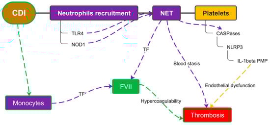 Inflammasome activation has been associated with thromboembolic events. This phenomenon finds its explanation in the close relationship between inflammation and thrombosis, two mechanisms that can interact by forming a vicious cycle. Specifically, inflammation can alter the balance between pro-thrombotic and antithrombotic factors, thus favoring thrombus formation, whereas thrombus can amplify the inflammatory response []. Moreover, the involvement of inflammasomes in the pathophysiology of several inflammatory disorders such as systemic lupus erythematosus (SLE), rheumatoid arthritis (RA), and inflammatory bowel diseases (IBDs) with prominent pro-thrombotic phenotypic features confirms the strong interaction between inflammation and coagulation. Activation of inflammasomes has been shown to act as an independent risk factor for thrombosis in patients with SLE. Similarly, recent work has shown an increased expression of NOD2, NLRP3, and NLRC5 in cytoplasmic antineutrophilic antibody (ANCA) associated with vasculitis (AAV), compared to normal controls. The pathogenetic role of NLRP3 in IBDs has also been explored. Patients with IBD have an up to three times higher risk of thromboembolic complications associated with an increased morbidity and mortality []. The inflammasome promotes thrombus formation by recruiting immune system cells, endothelial cells, and platelets []. CDI is characterized by a degree of absolute neutrophil count in peripheral blood, this finding is highly related to sepsis and is considered as an indicator of poor prognosis. IL-23 release can be enhanced by neutrophils through the activation of NF-kB []. The importance of inflammasome and its potential role in thrombosis has been highlighted in a recent study describing how NLRP3 activation increases the risk of venous thromboembolism (VTE) in response to hypoxia. Using a murine model of venous thrombosis, the authors showed that systemic hypoxia is associated with the activation of the NLRP3 inflammatory complex and the production of IL-1β, which accelerates the development of venous thrombosis. Histological examination of thrombus showed increased recruitment of neutrophils and macrophages into the vein in mice subjected to hypoxia compared with controls []. The exact molecular mechanism by which the inflammasome exerts its influence in the pathophysiology of thrombosis still needs to be explored. Signaling pathways through which NLRP3 contributes to endothelial and platelet activation are still ambiguous. Therefore, a clear definition of the pathways targeted by NLRP3 inflammasome under hypoxia could provide the clue toward the integrated involvement of hypoxia-NLRP3 inflammasome and vascular dysfunction/hypercoagulation [].