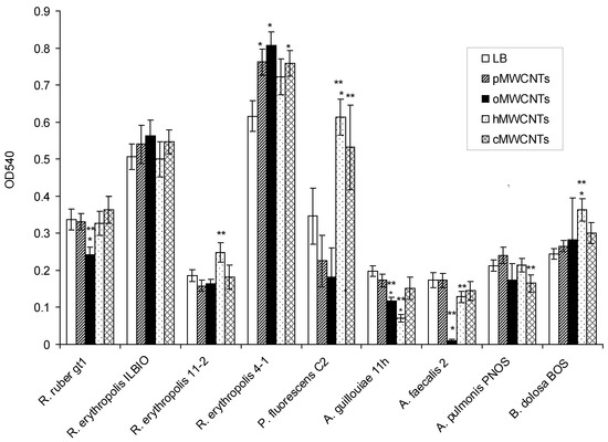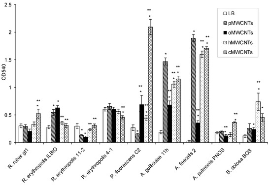 It was shown that, compared to the control, pMWCNTs caused a significant increase in the biofilm formation of R. erythropolis ILBIO, P. fluorescens C2, A. guillouiae 11 h, and A. faecalis 2. oMWCNTs caused an increase in the biofilm formation of R. erythropolis ILBIO, P. fluorescens C2, A. guillouiae 11 h, A. faecalis 2, and B. dolosa BOS. hMWCNTs caused an increase in the biofilm formation of P. fluorescens C2, A. guillouiae 11 h, A. faecalis 2, and B. dolosa BOS. cMWCNTs caused an increase in the biofilm formation of R. ruber gt1, P. fluorescens C2, A. guillouiae 11 h, A. faecalis 2, and B. dolosa BOS.