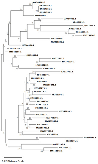 - Kumar, S.; Stecher, G.; Li, M.; Knyaz, C.; Tamura, K. MEGA X: Molecular Evolutionary Genetics Analysis across Computing Platforms. Mol. Biol. Evol. 2018, 35, 1547–1549. [Google Scholar] [CrossRef]