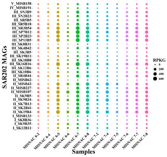 In situ transcriptional activities of SAR202 subclusters in the SCS. The dot size denotes the RPKG value, which reflects the in situ transcriptional activities of SAR202 species represented by different MAGs. The MAG IDs are initiated with a subcluster mark. The in situ samples were collected by MISNAC apparatus and the sampling time points are described in Table S1.