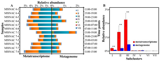 Relative abundance of SAR202 subclusters in metagenomic and metatranscriptomic data for different time periods. Twelve in situ microbial samples were continuously collected at 1022 m depth in the SCS by the MISNAC apparatus. (A) Percentages of 16S miTags of each SAR202 subcluster in all those extracted from metagenomes and metatranscriptomes are exhibited as their relative abundance. (B) The significant difference between metagenomics and metatranscriptomics data in relative abundance for each SAR202 subcluster was verified by t-test. ** represented a significant difference (p < 0.01).