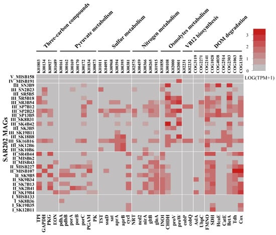 Transcriptional level of functional genes of SAR202 MAGs. For a functional gene, TPM values higher than 1 in three or more transcriptomic data from different time periods were averaged to estimate an overall transcriptional activity in a SAR202 species represented by the MAG. The gene names are shown in Table S5.