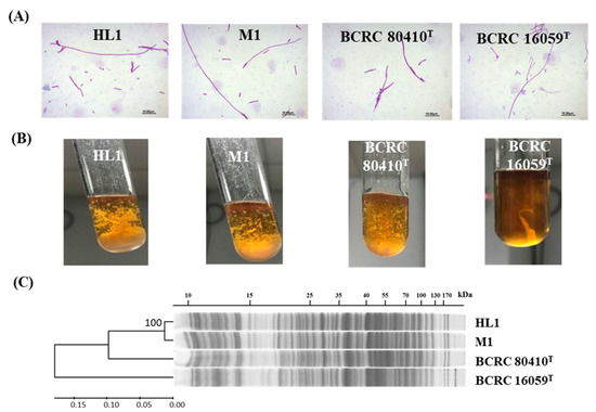 Phenotypic characteristics of L. kefiranofaciens strains HL1 and M1. (A) Morphology of cells grown in MRS broth; (B) Bacterial growth aspect in MRS broth; and (C) SDS-PAGE whole-cell protein profiles of four strains of L. kefiranofaciens. The banding patterns were clustered together using the UPGMA algorithm. The evolutionary distances are in the unit of the number of band differences per site, as calculated by p-distance.