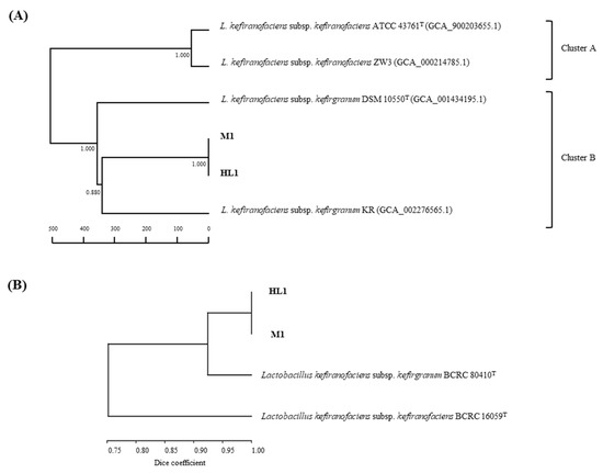 For the classification of L. kefiranofaciens strains HL1 and M1 at the subspecies level, phenotypic and genotypic characterizations were conducted with two reference strains (L. kefiranofaciens subsp. kefiranofaciens BCRC 16059T and L. kefiranofaciens subsp. kefirgranum BCRC 80410T).