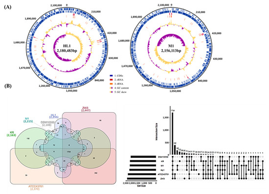 (A) Circular genome maps of L. kefiranofaciens HL1 and M1. The six circles (outer to inner) show the following. Circles 1 and 2 demonstrate the CDSs on the forward and reverse strands, respectively. Circles 3, 4, and 5 show the rRNAs and tRNAs and the GC content. Circle 6 represents the GC skew ((C − G)/(C + G)) curve (positive GC skew, orange; negative GC skew, violet); (B) Venn diagrams and Upset plot of coding sequences for the six L. kefiranofaciens strains.