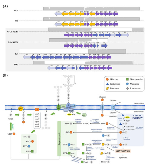 (A) Genetic organization of eps gene clusters in L. kefiranofaciens strains. Gene functional groups are marked with different colors. (B) Proposed biosynthesis pathway for the exopolysaccharide (EPS) production according to the Kyoto Encyclopedia of Genes and Genomes (KEGG) analysis.