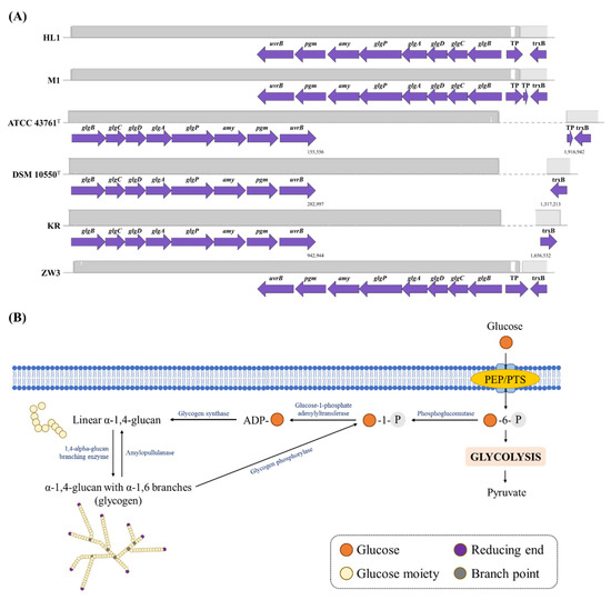 A complete glycogen metabolism (glg) operon was found in the HL1 and M1 genome (see Figure 5, Supplementary Table S5). Both strains possessed the following glycogen biosynthetic enzymes encoded by the corresponding genes: phosphoglucomutase (pgm), glycogen phosphorylase (glgP), glycogen synthase (glgA), glycogen biosynthesis protein GlgD (glgD), glucose-1-phosphate adenylyltransferase (glgC) and 1,4-alpha-glucan branching enzyme GlgB (glgB), similar to the other four strains (Figure 5A). According to a bioinformatic analysis, a biosynthetic model of glycogen in L. kefiranofaciens HL1 and M1 is proposed (see Figure 5B). Glucose is phosphorylated into glucose-6-phosphate by transportation into the cytoplasm by the phosphoenolpyruvate:carbohydrate phospho-transferase system (PEP:PTS). Glucose-6-phosphate is then transformed into glucose-1-phosphate by phosphoglucomutase. Glucose-1-phosphate acts as a substrate for ADP-glucose synthesis, which is catalyzed by glucose-1-phosphate adenylyltransferase (GlgC) [45]. ADP-glucose is converted into linear α-1.4-glucose by glycogen synthase (GlgA) for the extending chain. The linear oligosaccharide is then converted into a highly branched structure by 1,4-alpha-glucan branching enzyme (GlgB). Two enzymes, i.e., glycogen phosphorylase (GlgP) and amylopullulanase (Amy), are involved in the catabolism of glycogen. GlgP catalyzes the sequential phosphorolysis of α-1,4-glucosyl linkages in the glucan chain from the non-reducing ends [46]. Finally, limited dextrins are generated by GlgP [47].