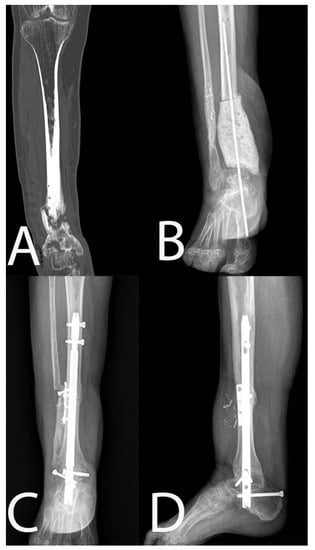 No recurrence of infection was observed in our series, thus showing that the vascularized soft-tissue cover provided by free flaps at the time of surgical debridement can help in fighting chronic/late-onset FRI. The use of a free flap, despite increasing surgical difficulties and the incidence of possible early complications, can offer exciting medium to long-term results. This was evident with both treatments (single-stage vs. staged approach). In five cases, a more conservative approach was possible. The use of antibiotic-loaded bone substitutes permits filling bone cavities after surgical debridement. They offer a scaffold for new bone formation in order to restore the mechanical and physiological properties of the bone [30]. Previous reports highlighted that surgical debridement plus antibiotic-loaded bone substitutes lead to a high healing rate compared with surgical debridement alone [25,31,32,33]. In eight patients with extensive or circumferential involvement and in those with non-healed pseudoarthrosis, the DT was sacrificed, thus leading to a massive bone defect. The appropriate method of reconstruction for patients with a large DT defect remains controversial, with excellent results coming from the musculoskeletal oncology field, using a massive homologous graft to perform an ankle arthrodesis [28]. In one case, the massive defect was reconstructed with a custom-made prosthesis fixed in ankle arthrodesis, thanks to the potential additional benefits of silver coating in fighting infections [34,35].
