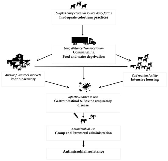 Surplus dairy calves are calves born on dairy farms that are either unsuitable or not required to replace the milking herd [4]. Most of these calves are male and are either sold for “bob” veal (marketed at <3 weeks of age), veal (milk-fed or formula-fed veal raised mainly only on a milk-based diet with some amount of grain and marketed at 20 weeks of age; grain-fed veal raised mainly on a milk-based diet until 6–8 weeks of age before transitioning to a grain-based diet and marketed at 8 months of age), or dairy beef (marketed at 12–14 months of age). Recently, however, there has been an exponential increase in the use of beef semen in Holstein cows leading to an increase in the number of surplus cross-bred calves [5]. The production stages in surplus calves involve sometimes long-distance transportation to the auction or livestock markets from where the calves are either sent for slaughter or are purchased by the calf raisers to be reared for a certain amount of time depending on the production system type. Throughout these stages, surplus calves experience many health challenges [6,7,8,9,10,11,12,13], leading to an increased risk of disease and subsequent antimicrobial use (AMU) as represented in Figure 1 [4].