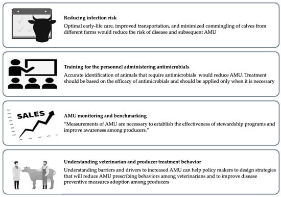 Selective application of antimicrobials or reserving AMU where it is necessary for animal health is likely to be effective in reducing AMU. However, some routine applications of antimicrobials lack documented evidence of efficacy. Metaphylactic treatment based on oral administration of antimicrobials for healthy and diseased animals within the same group can be a frequent practice [42], and for instance, U.S. producers sometimes use extra-label administration of antimicrobials in the water to treat or prevent gastrointestinal disease. The efficacy of this practice has not been documented, and optimal antimicrobial stewardship will require evidence to support routine use. Similarly, appropriate training is necessary for farm personnel to accurately identify instances requiring antimicrobial therapy and to follow veterinary written treatment protocols. Two-thirds of veal producers in the Midwestern United States reported routinely using antimicrobials when presented with uncomplicated cases of diarrhea that could be managed with non-antimicrobial interventions [102]. Indeed, training on the accurate identification of calves with diarrhea and pneumonia led to better-targeted therapy and a 50% reduction in the quantity of antimicrobials on Ohio veal herds [30]. Routine implementation of more selective application of antimicrobials will require an additional understanding of behavioral drivers and barriers among farm personnel and veterinarians responsible for AMU. Research has begun to identify the drivers and barriers that influence veterinarians’ and farm owners’ intentions to make treatment decisions [103]. The risk aversion to the high mortality rate among veal calves has been found to facilitate the start of antimicrobial therapy among veterinarians in Flanders, Belgium [20]. Additionally, veterinarians acknowledged that they were afraid of legal action from their employers in the event of negative clinical outcomes if they refuse to treat with antimicrobials [103]. Veterinarians wanted to make responsible usage of antimicrobials, but sometimes they responded to the uncertainty of clinical cases and the need for favorable results by prescribing antimicrobials [104].
