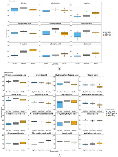 (a) Impact of soil moisture perturbations on metabolites shown as log2-fold abundances of amino acid that shifted significantly in response to a moisture treatment (Dry-Wet, Saturation, or Wet-Dry). Nine amino acids changed significantly under the wet or dry treatments compared to control (p < 0.05, one-way ANOVA). Whiskers indicate the most extreme values within 1.5 multiplied by the interquartile region. Box, 25% quartile; median, 75% quartile. Pairwise comparisons of means to test treatment effects were performed after outlier removal. (b) Impact of soil moisture perturbations on the soil metabolome shown as log2-fold abundances of metabolites (other than amino acids) that shifted significantly in response to a moisture treatment (Dry-Wet, Saturation, or Wet-Dry). Fifteen of 70 detected metabolites changed significantly under the wet or dry treatments compared to control (p < 0.05, one-way ANOVA). Whiskers indicate the most extreme values within 1.5 multiplied by the interquartile region. Box, 25% quartile; median, 75% quartile. Pairwise comparisons of means to test treatment effects were performed after outlier removal.