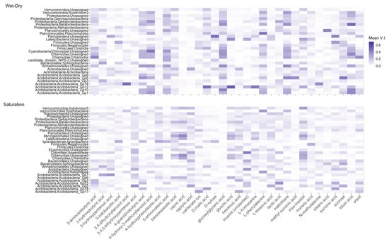 Metabolites ranked based on their mean variable importance for predicting OTUs under Wet-Dry (top) and Saturation (bottom) treatments.