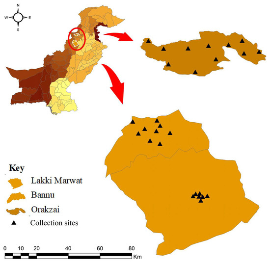 The current study investigated three districts of southern KP, including Lakki Marwat (32.6135° N, 70.9012° E), Bannu (32.9910° N, 70.6455° E), and Orakzai (33.6671° N, 70.9547° E). These districts belong to two distinct physiographic regions, one with a “hot semi-arid climate” (Bannu and Lakki Marwat) and the other with a “humid subtropical climate” (Orakzai). Based on the ecological zones, the former is mainly a “desert plain,” and the latter is mainly a semi-arid piedmont. The geographic coordinates of each collection site were obtained using Global Positioning System (GPS) and loaded into a Microsoft Excel sheet to design a map using ArcGIS 10.3.1.3 (ESRI, Redlands, CA, USA) (Figure 1).