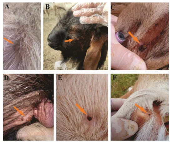 Tick infestation on different hosts: Hy. dromedarii from camels (A). Ha. bispinosa from goats (B). R. turanicus from sheep (C). Hy. anatolicum from male Asian water buffaloes (D). R. sanguineus from dogs (E). R. turanicus from goats (F).