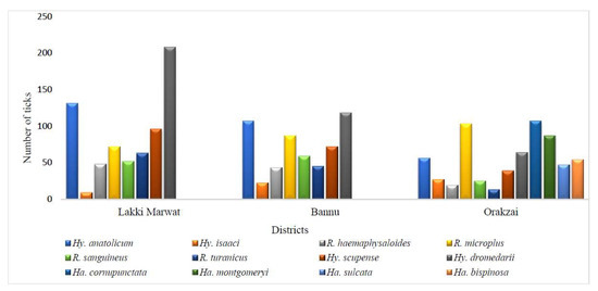 The highest number of ticks were recorded from Lakki Marwat (679/1873, 36.3%), followed by Orakzai (641/1873, 34.2%), and Bannu (553/1873, 29.5%). Herein, eight tick species were reported representing two genera from Lakki Marwat in which Hy. dromedarii (208/679, 30.6%) was the most abundant, followed by Hy. anatolicum (131/679, 19.3%), and Hy. scupense (96/679, 14.1%). Eight tick species comprising two tick genera were recorded from the Bannu district in which Hy. dromedarii (118/553, 21.3%) was the most abundant species, followed by Hy. anatolicum (107/553, 19.3%), and R. microplus (87/553, 15.7%). In contrast, Ha. cornupunctata (107/641, 16.6%) was the most dominant species in the Orakzai district, followed by R. microplus (103/641, 16%) and Ha. montgomeryi (87/641, 13.5%). Haemaphysalis species were only found in the Orakzai district, while we could not collect these species in the other two districts. The details of each tick species reported from the study area are provided (Figure 3).