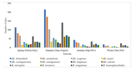 Tick abundance was highly fluctuated by seasonal variations. The highest number of ticks were reported in summer (June–August) (1009/1873, 53.9%), followed by spring (March–May) (522/1873, 27.9%), autumn (September–November) (230/1873, 12.3%), and winter (Dec–Feb) (112/1873, 5.9%) (Figure 4). Details about the seasonal abundance of each tick species in all four seasons are presented in the graph (Figure 4).