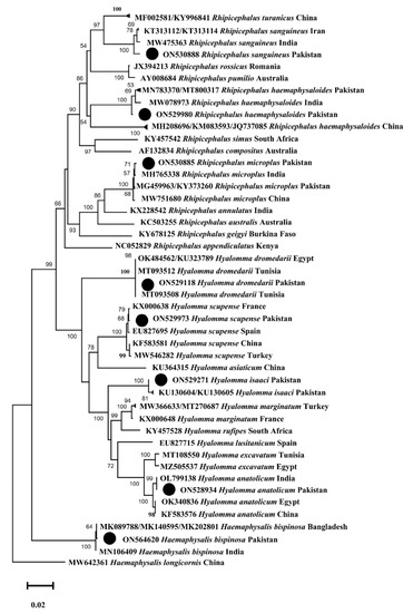 All the obtained cox1 sequences were uploaded to the GenBank under accession numbers: ON529118 (Hy. dromedarii), ON528934 (Hy. anatolicum), ON529973 (Hy. scupense), ON529271 (Hy. isaaci), ON564620 (Ha. bispinosa), ON530885 (R. microplus), ON530888 (R. sanguineus), and ON529980 (R. haemaphysaloides). The obtained 16S rRNA sequences were uploaded under accession numbers: ON911440 (R. turanicus), ON911369 (Ha. cornupunctata), ON911371 (Ha. montgomeryi), and ON911372 (Ha. sulcata). The phylogenetic trees of the obtained cox1 and 16S rRNA sequences are shown in Figure 5 and Figure 6, respectively.