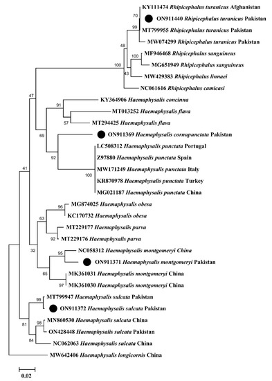 The phylogenetic tree for the cox1 sequences of Hy. dromedarii, Hy. anatolicum, Hy. scupense, Hy. isaaci, Ha. bispinosa, R. microplus, R. sanguineus, and R. haemaphysaloides were constructed combinedly with 49 sequences downloaded from NCBI based on the maximum identity. In the phylogenetic tree, the obtained cox1 sequences were clustered to the corresponding species reported from different countries, such as Hy. dromedarii from Egypt and Tunisia, Hy. anatolicum from India, Egypt, and China, Hy. scupense from France, Spain, China, and Turkey, Hy. isaaci from Pakistan, Ha. bispinosa from India and Bangladesh, R. microplus from Pakistan, India, and China, R. sanguineus from Iran and India, and R. haemaphysaloides from Pakistan, India, and China. In the case of 16S rRNA, the phylogenetic tree of R. turanicus, Ha. cornupunctata, Ha. montgomeryi and Ha. sulcata was constructed with 27 sequences downloaded from NCBI based on the maximum identity. In the phylogenetic tree, 16S rRNA sequences of R. turanicus, Ha. montgomeryi and Ha. sulcata clustered with the same species reported from Afghanistan, Pakistan, and China, while Ha. cornupunctata clustered with the species of the same subgenus Ha. (Aboimisalis) punctata reported from China, Turkey, Italy, Spain, and Portugal.