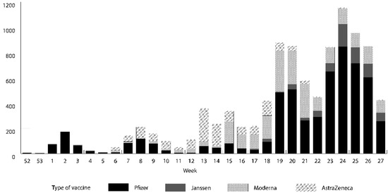 Between 27 December 2020 and 11 July 2021, 9945 out of 14,942 PLWH (66.6%) in our cohort received at least one dose of a SARS-CoV-2 vaccine. The findings showed that 6949 (69.9%) were fully vaccinated and 2996 (30.1%) had received a first dose (Supplementary Tables). Vaccination among PLWH in Catalonia peaked between 14 and 20 June 2021 (week 24) (Figure 1). A majority of our cohort received the Pfizer-BioNTech vaccine (56.7%), followed by Moderna (23.2%), AstraZeneca (12.9%), and Janssen (7.2%).