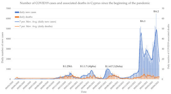Number of daily positive SARS-CoV-2 cases as well as the number of recorded COVID-19-associated deaths in Cyprus since the detection of the first case in March 2020 until April 2022 (https://www.data.gov.cy/, accessed on 30 May 2022).