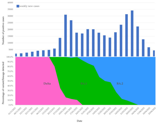 A similar pattern was observed in many countries around the world, where Delta and its sub-lineages had been the predominant variants during the last few months of 2021. Within a short period between the end of December 2021 and the first few weeks of January 2022, the percentage of Delta rapidly dropped, being replaced by the Omicron variant (see Supplementary Materials Figure S2) [28,29,30]. The emergence of the Omicron variant and its rapid spread was reportedly accompanied by a massive increase in case numbers, with the United Kingdom, for example, reporting record numbers of COVID-19 infections, with daily reported case numbers approaching 200,000 [31].