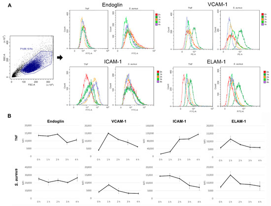 Flow cytometric analysis of adhesion molecules’ expression levels on the endothelial cell surface after incubation with TNF (25 ng/mL) and S. aureus 2879 M: (A) representative flow cytometry histograms for the endoglin, VCAM-1, ICAM-1, and ELAM-1 expression on the surface of EA.hy926 cells; (B) dynamics of endoglin, VCAM-1, ICAM-1 and ELAM-1 expression estimated using median fluorescence intensity (MFI) (error bars represent SD). There were at least 4 experiments for each time point.