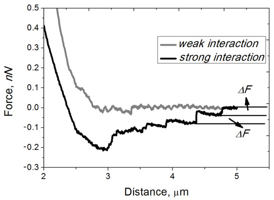 Typical curves depicting the interaction between an endothelial cell and a neutrophil, while the neutrophil was immobilized on the probe and the endotheliocyte adhered to the surface of the Petri dish. The black curve shows a strong adhesive contact between two cells, as steps are clearly visible (ΔF). The gray curve shows a weak (non-specific) contact, i.e., there are no steps.