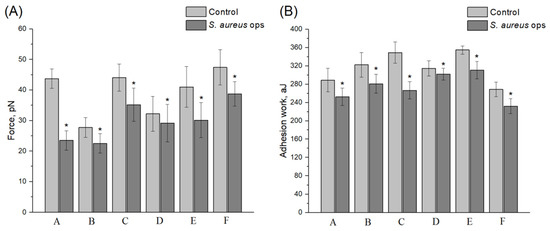 The main opsonins (the C3b/iC3b components of complement, IgG (all subclasses), IgM, and IgA [22]) from the serum in this method of strain treatment have their own receptors on the neutrophils, such as CD11b/CD18 and Fcγ (CD64, CD32, and CD16) [35]. Therefore, the preincubation of bacteria with the serum could affect the adhesive contacts between immune cells. However, as shown in Figure 4, although the drop in the force and especially in the work of adhesion was not as critical as that observed under the non-opsonized S. aureus condition, the adhesive contacts between neutrophils and endotheliocytes were still significantly reduced after treatment with opsonized S. aureus. The mean summary values across all the donors also showed a statistically significant decrease (Table 2).
