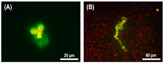 The neutrophil morphology after transendothelial migration in zone with S. aureus 2879 M. Neutrophils were stained with propidium iodide and FITC-labeled myeloperoxidase antibodies, and bacteria were used in concentrations of 2.5 × 107 cells/mL (up to 100 bacterial cells per 1 neutrophil in the case of about 10% migration rate): (A) Fast NETosis (neutrophil survived); (B) classical NETosis (neutrophil died).