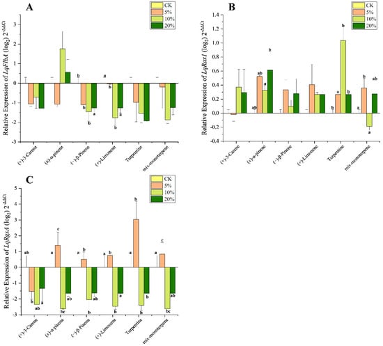 3.4. Effect of Terpenoids on Expression Level of LqRGS