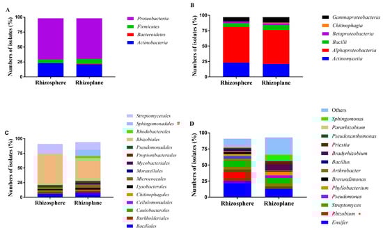 The taxonomic distribution of bacterial isolates, obtained from the rhizosphere and rhizoplane of C. medica, shown on Phylum (A), Class (B), Order (C), and Genera (D) level. Items labeled with * are taxa exhibiting significantly higher prevalence in the rhizosphere compared with the rhizoplane, while items with # are those with higher prevalence in the rhizoplane compared with the rhizosphere (Fisher’s exact test, p < 0.05).