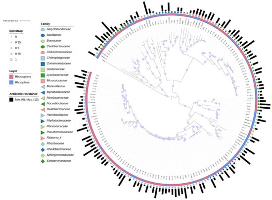 Phylogenetic tree, reconstructed based on the 16S rDNA sequences of the 174 isolates. The taxonomic information of the isolates is shown at the family level. The most inner circle is the isolate names. The second circle shows the origin of the isolates (rhizosphere—pink, rhizoplane—blue). The third circle is the taxonomic affiliation of the isolates. The outermost circle is the accumulated amount of antibiotics each isolate is resistant to.