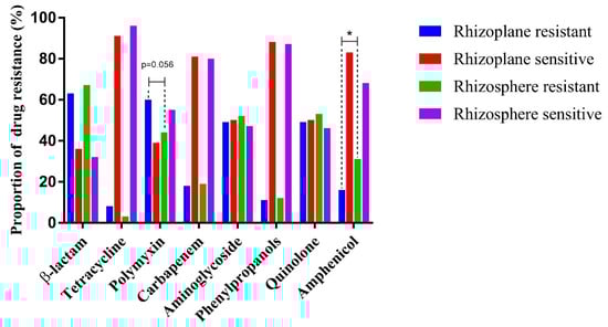 Antibiotic resistance profile differences between the rhizosphere and rhizoplane isolates. The prevalence difference of polymyxin and amphenicol-resistant isolates from the rhizosphere and rhizoplane was shown in the figure. Fisher exact test was used for antibiotic resistance profile comparison between the rhizosphere and rhizoplane isolates, and * denoted p < 0.05.
