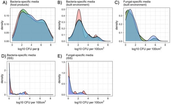 Density distribution for overall food items (A), Earth-built-environment (B,C), and ISS surface (D,E) cultivable microbial counts for all media types. In food-item and Earth-built-environment testing (A–C), agar was compared with both Petrifilm and Easy Plates, while in ISS surface sampling (D,E), agar was only compared with Easy Plates.