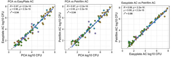 Correlation of agar and film media counts for PCA vs. Easy Plate AC, PCA vs. Petrifilm AC, and Easy Plate AC vs. Petrifilm AC for a variety of food items. Cultivable microbial counts are per milliliter, from swabbing food items and placing the swab in a 10 mL buffer solution. Solid blue line shows linear regression.