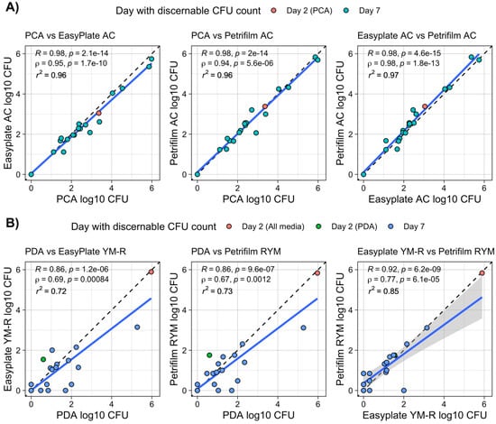 Cultivable microbial counts for both bacterial- and fungal-specific media ranged from below the detection limit to 106 per swab (per 100 cm2 surface area) for built-environment surface samples (Figure 1B,C). There were no significant differences between mean cultivable microbial counts among the three media types, for either bacterial- or fungal-targeted media. In all cases, mean log10 differences between media types were less than 2.5 colonies (i.e., <100.34). Similar to the results for food items, the correlations between bacterial-specific film and agar media were high, with R2 values between 0.96 and 0.97, and no significant differences between the mean cultivable microbial counts were detected (Table 1, Figure 3). The correlations between cultivable microbial counts for fungal-specific media were lower than those for bacteria, with R2 values of ~0.73 for both Petrifilm RYM and Easy Plate YM-R when correlated to PDA. Easy Plate YM-R and Petrifilm RYM had higher correlations between them (R2 = 0.85), but there was still considerable variation in their counts. Paired Wilcoxon tests showed that Easy Plate AC had slightly lower cultivable microbial counts than both PCA and Petrifilm AC, which, as stated previously, was not large enough to cause a difference in mean cultivable microbial counts. The mean log10 differences between the media types were <0.34 (i.e., a non-log difference of 2 or fewer colonies) in all cases.