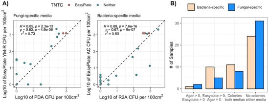 (A) Correlations between EasyPlate vs. agar cultivable microbial counts for fungal-specific (PDA vs. EasyPlate YM-R) and bacterial-specific (R2A vs. Easy Plate AC) media for ISS samples. TNTC = too numerous to count. TNTCs are included as arbitrarily high numbers in this figure but are not included in model calculations; (B) number of samples with zero vs. non-zero values for agar media vs. Easy Plates for ISS samples.
