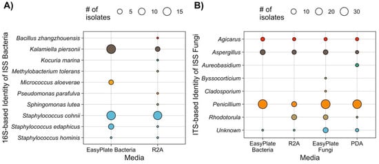 (A) Distribution of bacterial species isolated from Easy Plate AC vs. R2A agar media; (B) distribution of fungal genera isolated from Easy Plate AC and YT, and R2A, and PDA agar media. Points are colored by genus.
