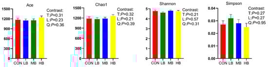 Alpha diversity index of lactating dairy cows fed treatment diets. CON (control, no by-products), low by-products (1.67%) (LB: 0.83% SH + 0.84% BP), medium by-products (3.33%) (MB: 1.67% SH + 1.66% BP), and high by-products (5%) (HB: 2.5% SH + 2.5% BP) (DM basis). T, treatment effect; L, linear effect; Q, quadratic effect.
