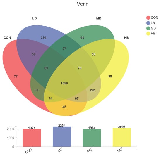 Venn diagram that revealing the relationship of operational taxonomic units (OTUs) of fecal bacteria in cows among treatments. Each circle represents a kind of diet. The number of OTUs shared between the corresponding groups is represented in overlapping areas; the numbers in non-overlapping areas of circles represent OTUs not shared between groups. CON (control, no by-products), low by-products (1.67%) (LB: 0.83% SH + 0.84% BP), medium by-products (3.33%) (MB: 1.67% SH + 1.66% BP), and high by-products (5%) (HB: 2.5% SH + 2.5% BP) (DM basis).