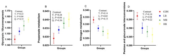 Predicted fecal bacterial function by PICRUSt analysis (KEGG level-3 pathways) of lactating Holstein cows fed diets with by-products substituted for forage. (A): Glycolysis/Gluconeogenesis; (B): Propanoate metabolism; (C): Nitrogen metabolism; (D): Pentose and glucuronate interconversions. CON (control, no by-products), low by-products (1.67%) (LB: 0.83% SH + 0.84% BP), medium by-products (3.33%) (MB: 1.67% SH + 1.66% BP), and high by-products (5%) (HB: 2.5% SH + 2.5% BP) (DM basis). T, treatment effect; L, linear effect; Q, quadratic effect.