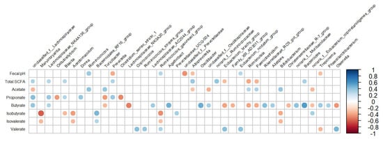 Correlation coefficients between the abundance of bacterial genera (≥0.1%) in feces and fecal pH and short-chain fatty acids for lactating cows fed treatment diets. Blue dots indicate a positive relationship between bacterial genus abundance and production parameters, while red dots represent a negative relationship between them. Larger dots indicate a stronger correlation.