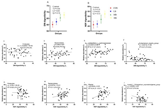 The DM (A) and NDF (B) digestibility of cows fed treatment diets, the correlation between DM digestibility and the relative abundance of Firmicutes (C) and Bacteroidetes (D) at the phylum level, and the relative abundance of unclassified_f__Lachnospiraceae (E) and Eubacterium_brachy_group (F) at the genera level; and the correlation between NDF digestibility and the relative abundance of Firmicutes (G) and Bacteroidetes (H) at the phylum level and the relative abundance of Blautia (I) and norank_f__Eubacterium_coprostanoligenes_group (J) at the genera level. CON (control, no by-products), low by-products (1.67%) (LB: 0.83% SH + 0.84% BP), medium by-products (3.33%) (MB: 1.67% SH + 1.66% BP), and high by-products (5%) (HB: 2.5% SH + 2.5% BP) (DM basis). T, treatment effect; L, linear effect; Q, quadratic effect.